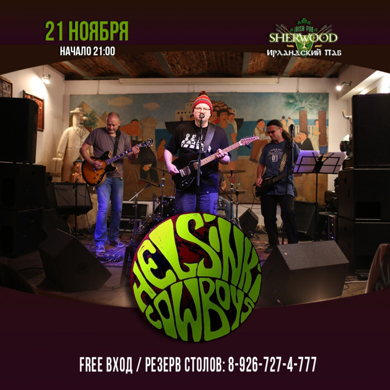 Погрузиться в атмосферу английского паб-рока можно и в наши дни. HELSiNKi COWBOYS реконструируют стиль! Программа состоит из большого количества самобытных номеров и ряда некогда популярных шлягеров, пропущенных через призму авторского восприятия. Всё это не без доли юмора, натиска, а главное искренности, так характерной для лучших представителей стиля под названием английский ПАБ-РОК.